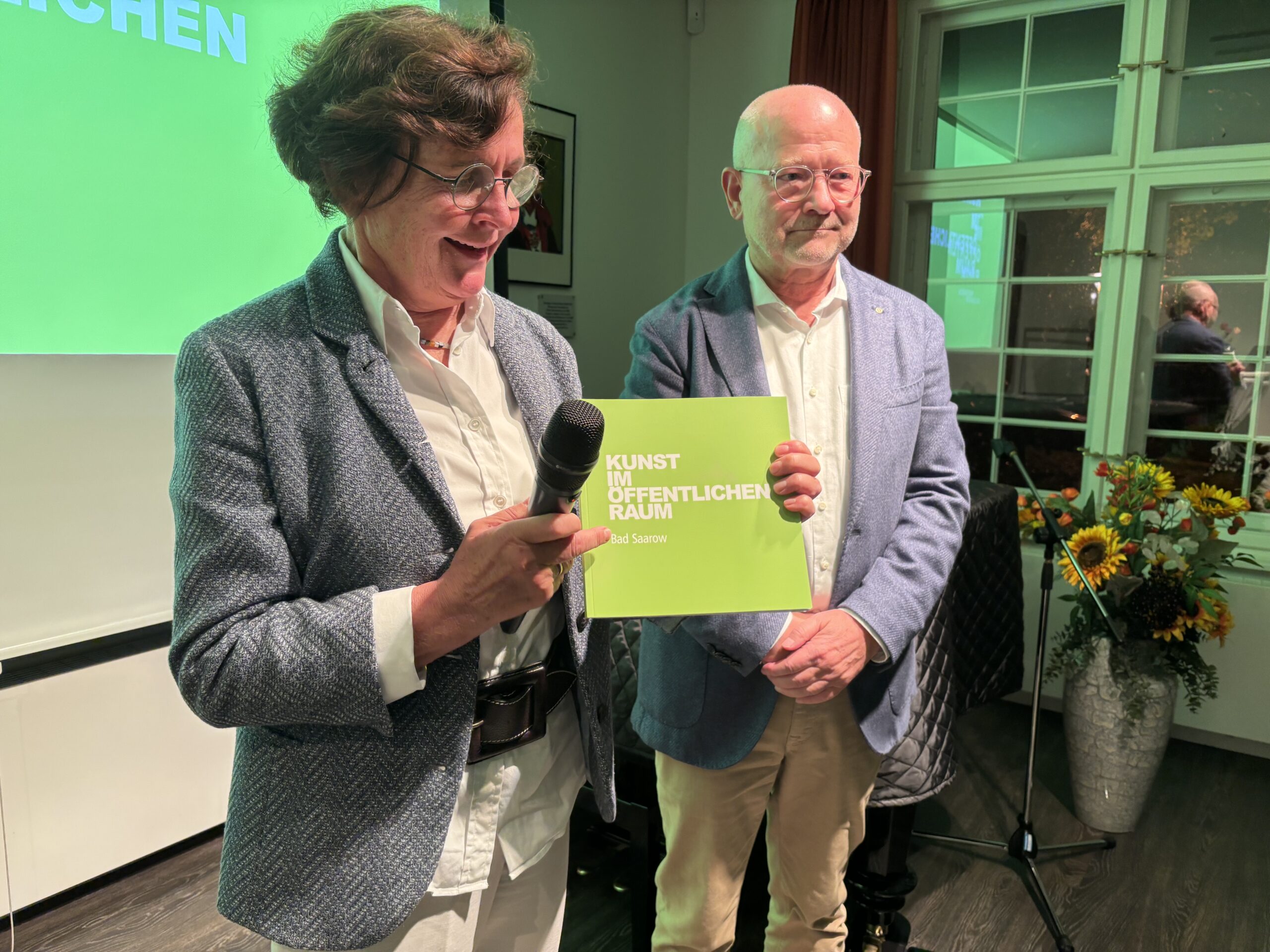 Erstmals gibt es ein Buch über Kunst im öffentlichen Raum in Bad Saarow. Herausgegeben haben die 70-seitige bebilderte Hochglanz-Broschüre Steffi und Frank Berthold – in privater Initiative. Nach zweijähriger Arbeit war es soweit: Am 21. Oktober wurde die „gedruckte Kunst“ im Scharwenka Kulturforum von den Machern präsentiert. Die Resonanz war riesig, rund 70 Interessierte waren gekommen, alle Plätze im Konzertsaal waren besetzt. Darunter auch eine große Gruppe des Rotary Clubs Bad Saarow-Scharmützelsee, der verschiedene Kunstprojekte am Wiesenweg gesponsert hat, unter anderem die Holzskulptur „Die Fäuste fliegen“ mit dem berühmten Boxer Max Schmeling und Kunst zur Erinnerung an die Moorhexe. Steffi Berthold sagte zu Begrüßung, es sei höchste Zeit gewesen für diese Publikation, denn immer mehr Zeitzeugen, insbesondere auch die Künstler, lebten nicht mehr.