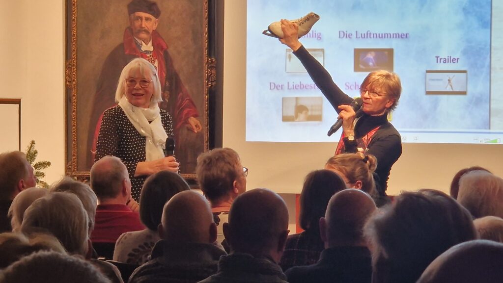 Wer an diesem Abend etwas zeitiger im Scharwenkahaus eintraf, um bei der Veranstaltung einen guten Platz zu bekommen, erlebte sofort eine sehr quirlige temperamentvolle kleine Frau, die hin und her lief, Licht und Ton noch mal checkte und dann auch schon zwischendurch erste Bücher signierte und mit den Gästen plauderte. Also keine stille Meditation in der Künstlergarderobe vor dem Auftritt! Sofort mittendrin und dem Publikum zugewandt erlebte man hier eine interessante Persönlichkeit- die erfolgreichste Berliner Eiskunstläuferin Christine Stüber-Errath. Sie machte dann als erstes eine kleine Liebeserklärung an Bad Saarow. Sie war hier sehr oft mit ihrem Ehemann Paul, der leider in diesem Jahr verstorben ist. Es war schon immer ein Sehnsuchtsort, verbunden mit sehr vielen glücklichen Erinnerungen. Und das war auch immer wieder das Stichwort an diesem Abend: Erinnern, in schöne Erinnerungen investieren und diese wollte sie nun gemeinsam mit den Gästen hervorholen. Denn die meisten waren ja gekommen, weil sie diese tolle Eiskunstläuferin und ihre großartigen Bewegungen auf dem Eis in den 70er Jahren mit verfolgt hatten.