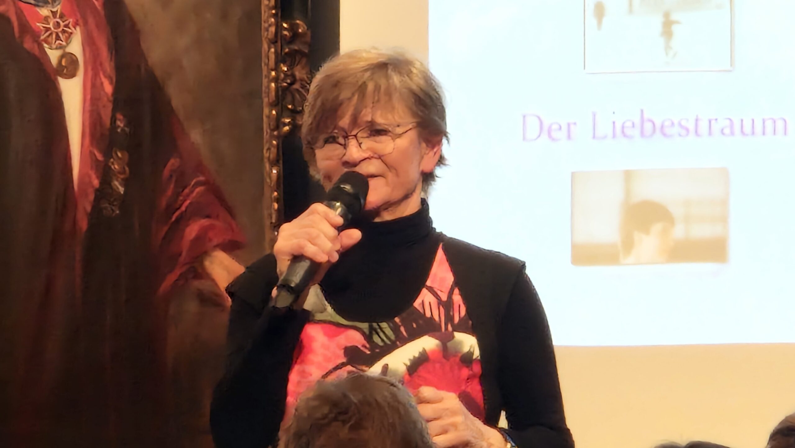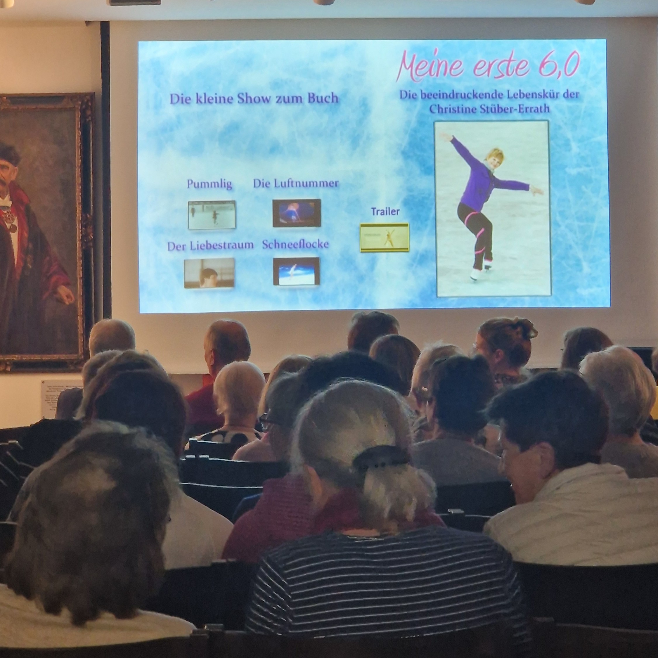 Wer an diesem Abend etwas zeitiger im Scharwenkahaus eintraf, um bei der Veranstaltung einen guten Platz zu bekommen, erlebte sofort eine sehr quirlige temperamentvolle kleine Frau, die hin und her lief, Licht und Ton noch mal checkte und dann auch schon zwischendurch erste Bücher signierte und mit den Gästen plauderte. Also keine stille Meditation in der Künstlergarderobe vor dem Auftritt! Sofort mittendrin und dem Publikum zugewandt erlebte man hier eine interessante Persönlichkeit- die erfolgreichste Berliner Eiskunstläuferin Christine Stüber-Errath. Sie machte dann als erstes eine kleine Liebeserklärung an Bad Saarow. Sie war hier sehr oft mit ihrem Ehemann Paul, der leider in diesem Jahr verstorben ist. Es war schon immer ein Sehnsuchtsort, verbunden mit sehr vielen glücklichen Erinnerungen. Und das war auch immer wieder das Stichwort an diesem Abend: Erinnern, in schöne Erinnerungen investieren und diese wollte sie nun gemeinsam mit den Gästen hervorholen. Denn die meisten waren ja gekommen, weil sie diese tolle Eiskunstläuferin und ihre großartigen Bewegungen auf dem Eis in den 70er Jahren mit verfolgt hatten.