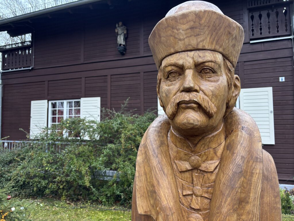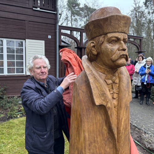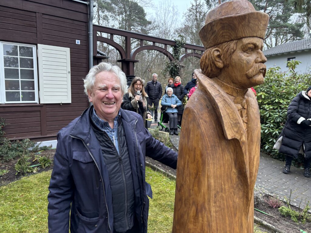 Knapp zwei Meter groß und 300 Kilo schwer, geschaffen aus edlem Eichenholz – so präsentiert sich Xaver Scharwenka seit dem 4. Advent vor dem Scharwenkahaus. Ja, er schaut ein bisschen ernst, aber sein stattliches Antlitz erweckt die Aufmerksamkeit, als wollte er sagen: Nur zu, treten Sie ein in meine Musenhütte! So nannte der Komponist, Pianist und Musikpädagoge sein villenartiges Haus im Gebirgsstil, das er 1910 in Bad Saarow errichten ließ.