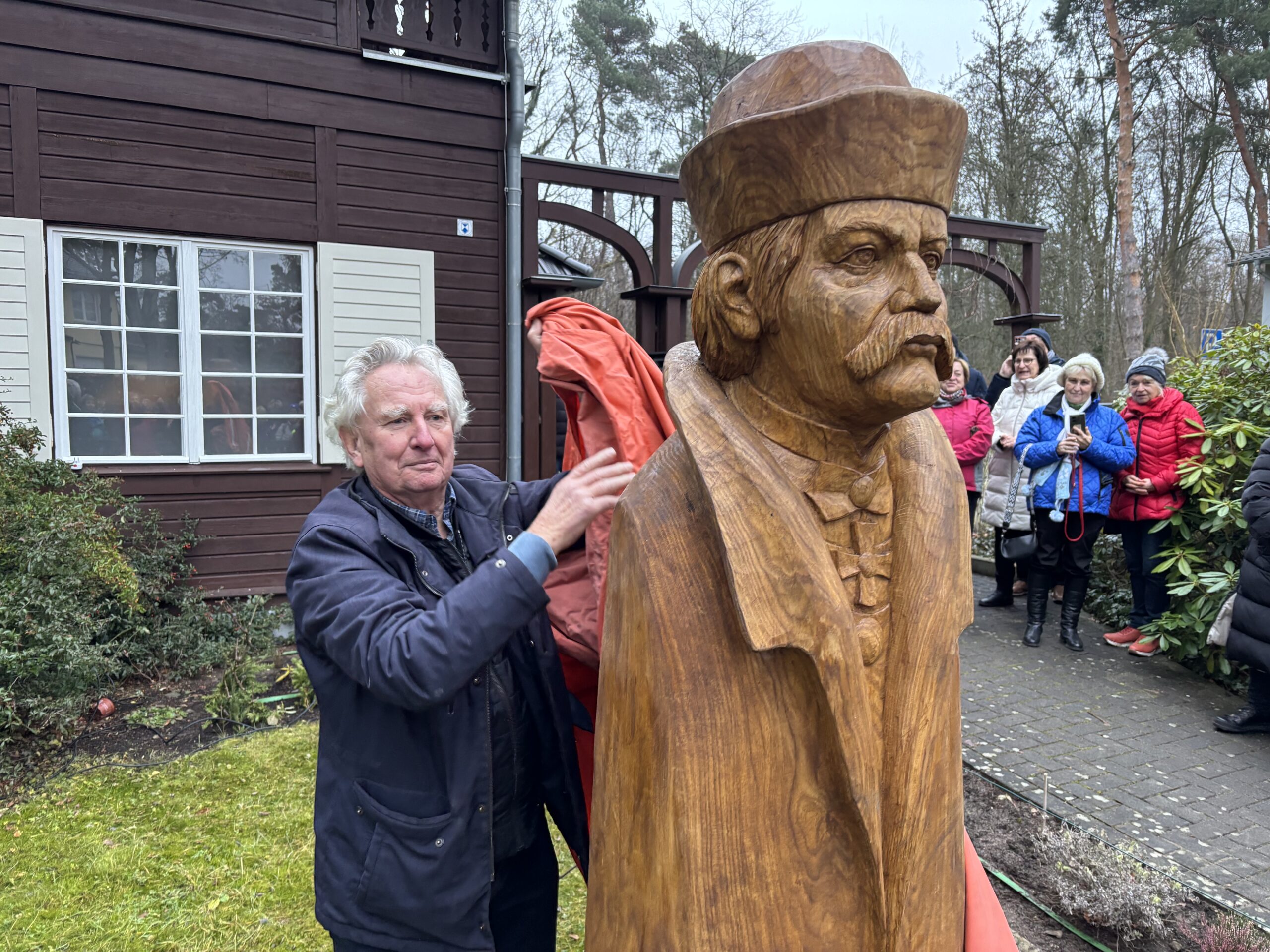 Schon seit einigen Tagen stand die Statue verhüllt im Vorgarten, stolz konnte nun Lutz Storr unter den Augen der Schaulustigen das Geheimnis lüften und das orangene Tuch herunterziehen. Für sein Engagement zollte nicht nur Vereinsvorsitzende Vera Jaspers Lutz Storr ihre Anerkennung, sondern auch die zahlreichen Gäste, die mit Applaus und lobenden Worte nicht sparten: Ja, der Lutz ist hartnäckig – und ein Macher!