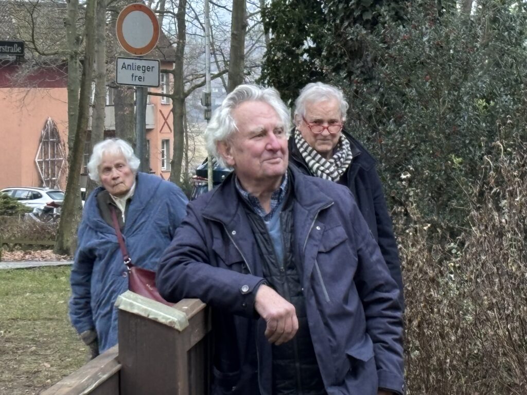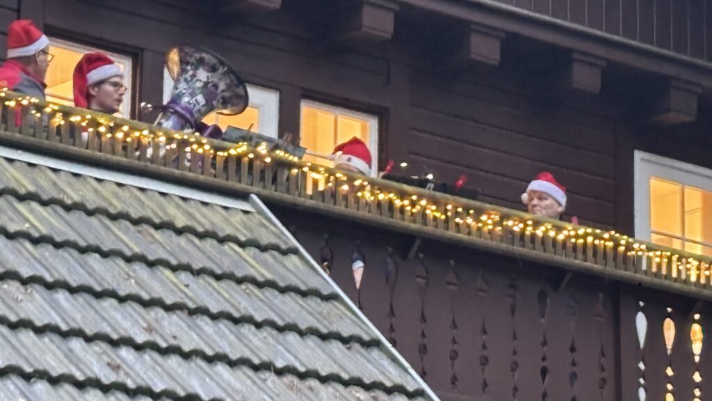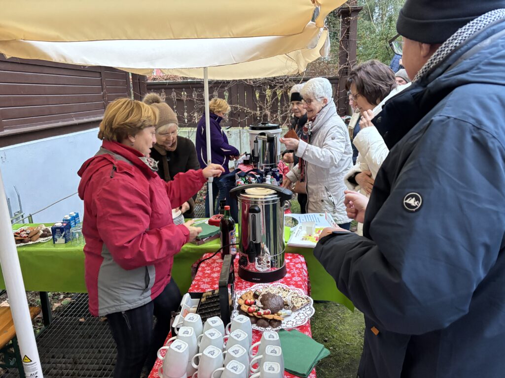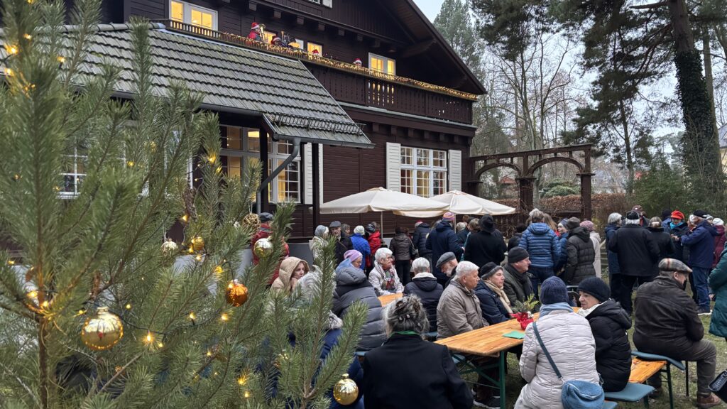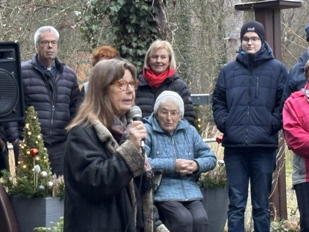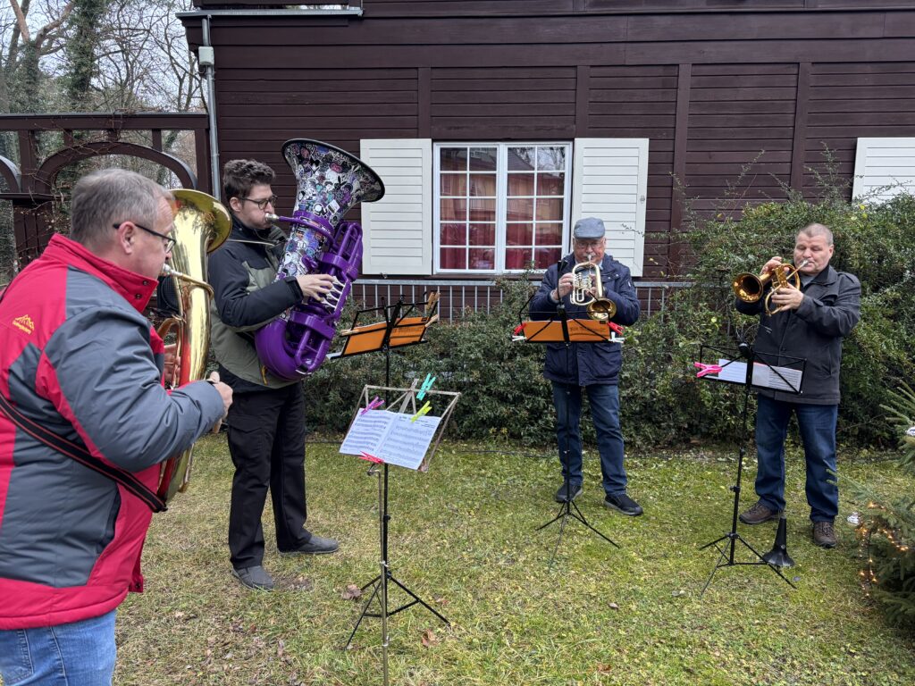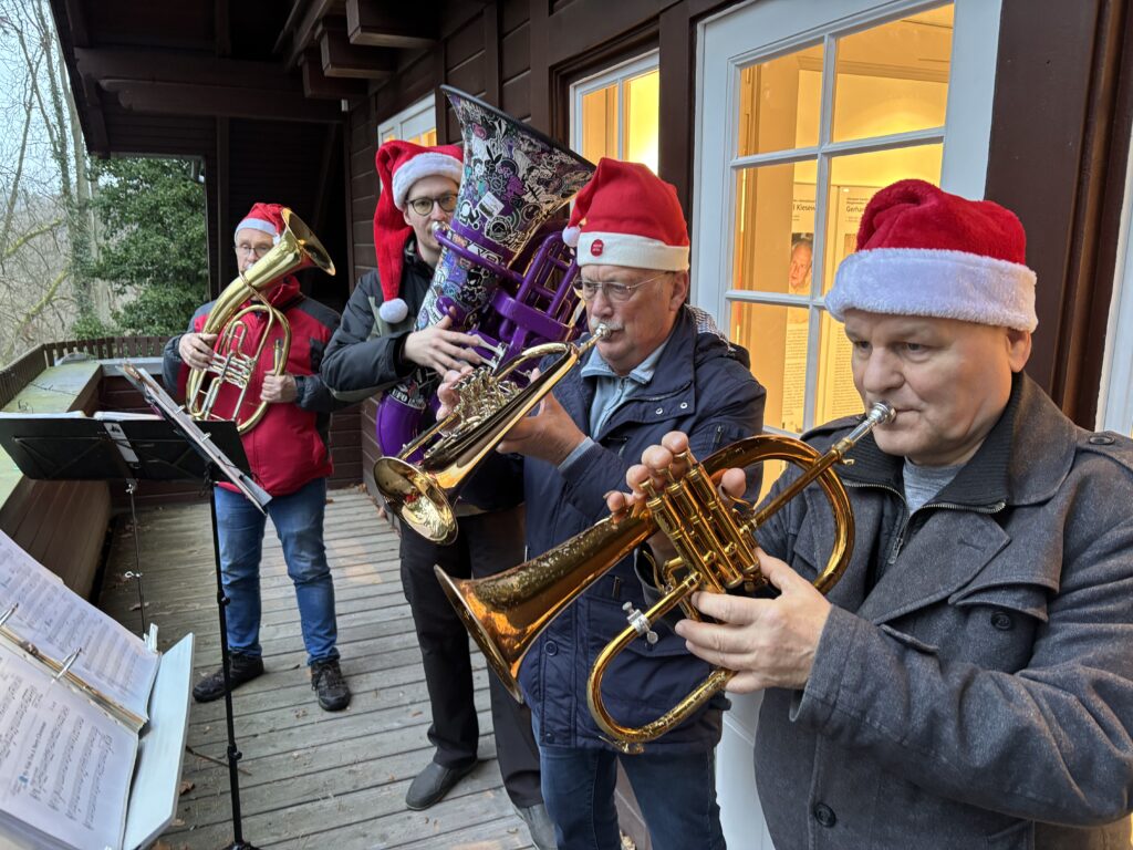 Nach der Zeremonie gingen alle in den Garten, wo schon die Stände mit heißem Glühwein, Kinderpunsch und Kaffee sowie Stollen und Plätzchen aufgebaut waren, das Holz in den Feuerschalen loderte und der Weihnachtsbaum leuchtete. Drinnen las Vereinsmitglied Regine Ulrich Kindern eigene Weihnachtsgeschichten vor. Vom Balkon spielten die Bläser so altbekannte Weihnachtslieder „Es ist ein Ros‘ entsprungen“, „Oh, Tannenbaum“, „Kommet ihr Hirten“ oder „Kling Glöckchen, kling“ spielten. Eine wunderschöne, idyllische Atmosphäre, wenn auch in diesem Jahr die Schneeflöckchen auf sich warten ließen. Aber die Gäste – immer wieder kamen neue hinzu, angelockt durch die Musik – amüsierten sich, plauschten miteinander, umarmten sich und wünschten sich zum Jahresende nur das Beste. Getrunken wurde reichlich: 30 Flaschen Glühwein und 18 Flaschen Kinderpunsch! Das ist gut für die Vereinskasse.