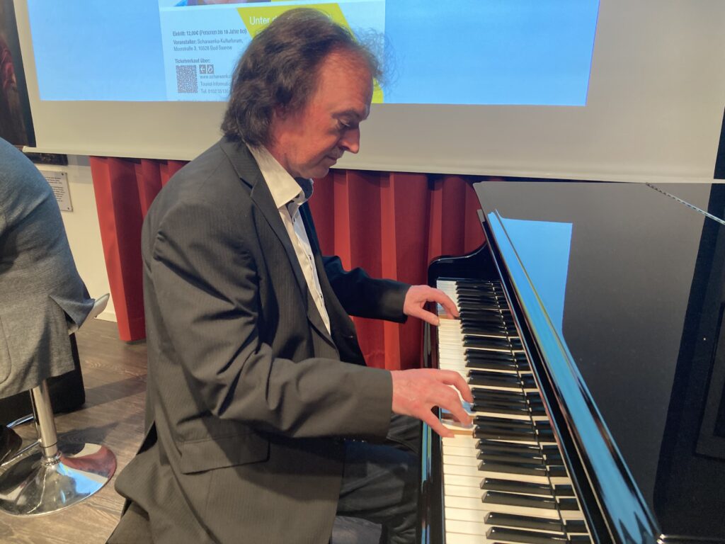 Zu Beginn der Modenschauen werden alle Gäste mit einem Glas Sekt und Livemusik begrüßt. Egbert Steinick spielt für sie zum Auftakt am Bechstein-Klavier.
